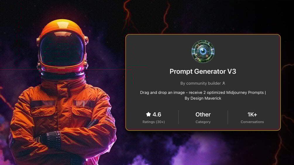 Prompt Generator V3 is a GPT Agent that analyzes any image to generate two unique, highly detailed Midjourney V6 prompts, plus extra tokens for precision.